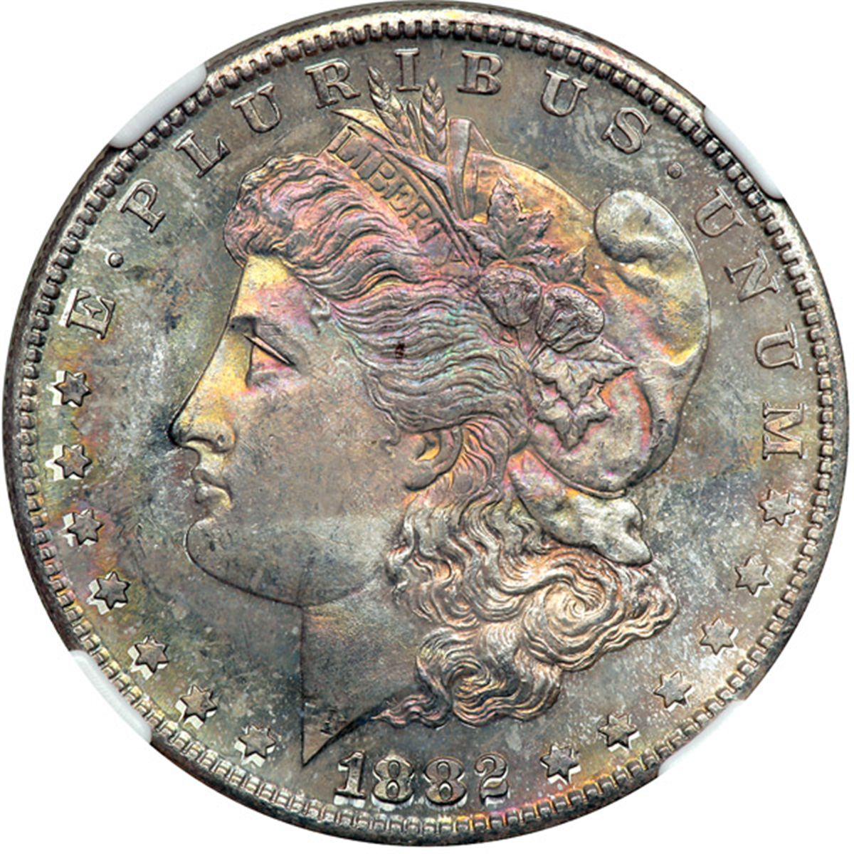 1882-S Morgan Dollar. NGC graded MS-65. Nice light obverse rainbow toning (PCGS # 7140) .