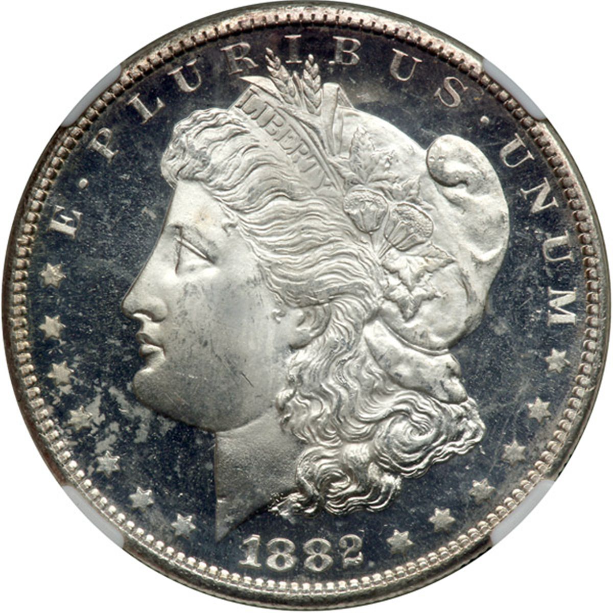 1882-S Morgan Dollar. NGC graded MS-66 Deep Mirror Prooflike. Well struck with blazing mirror surfaces on both sides. The mirror's depth attracts admirers from near and far on high-quality Morgan Sivler Dollars. Confirming the coin's scarcity in this grade, even though '82-S is common in frosty condition, is the low, low NGC census: Pop 9; none finer in DPL .