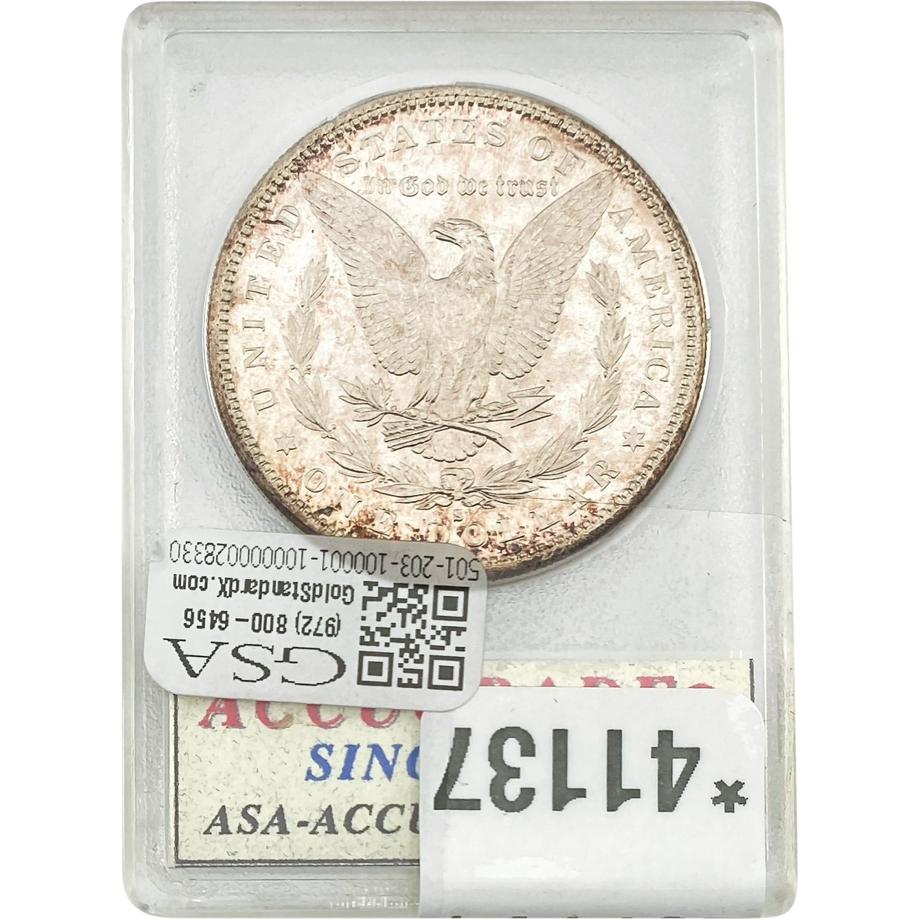 l. All non-certified coins and currency are guaranteed genuine, but are not guaranteed as to grade, since grading is a matter of opinion, an art and not a science, and therefore the description rendered by GSA or any third-party grading service may not agree with the opinion of others (including trained experts), and the same expert may not grade the same item with the same grade at two different times. GSA may, but is not obligated to, express an opinion as to non-certified numismatic items, in GSA’s opinion, or by its employees’ experience and the current interpretation of the American Numismatic Association’s standards as of the date the catalog was prepared. There is no guarantee or warranty expressed or implied that the grading opinions utilized by GSA, if any, will meet the standards of any grading service at any time in the future.