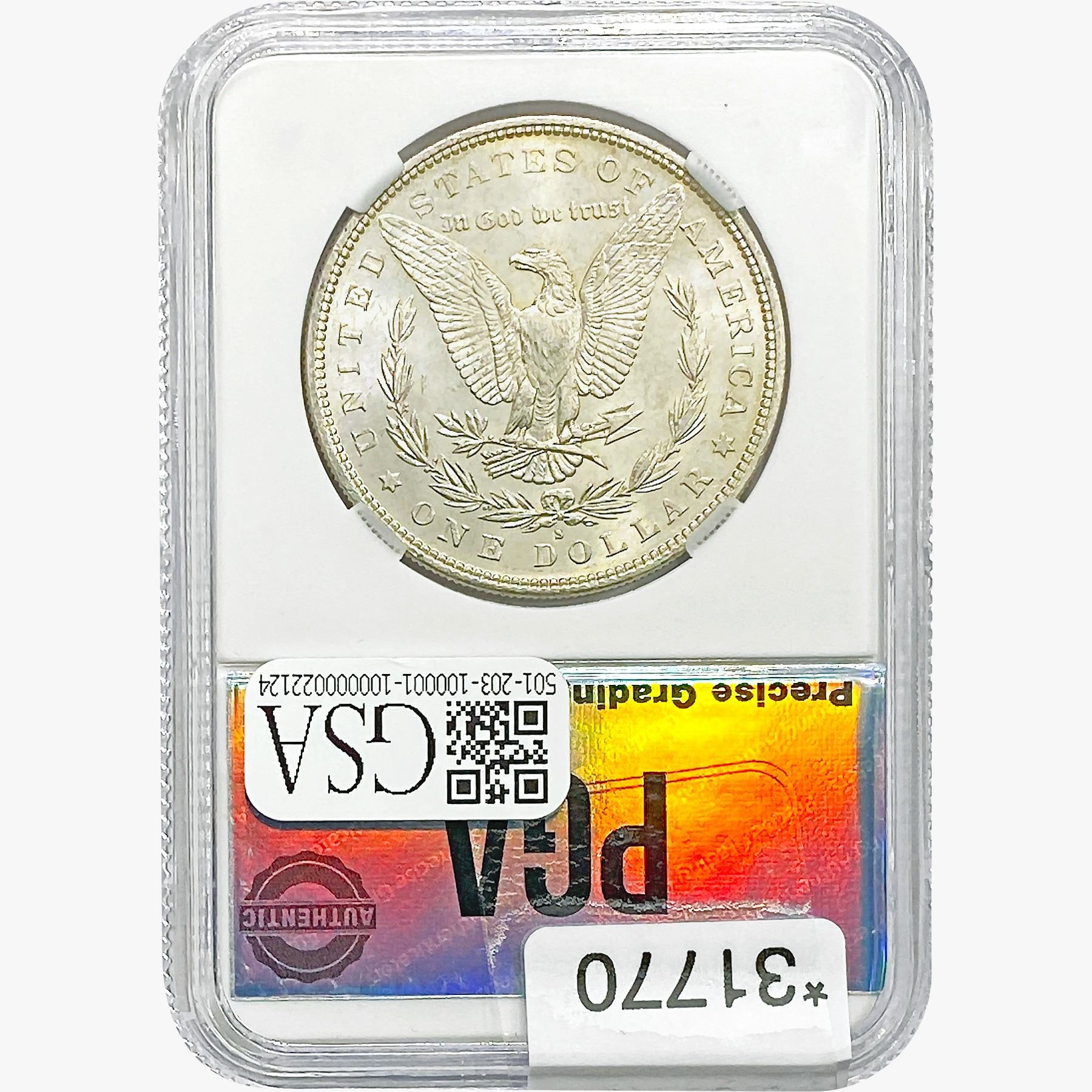 COINS AND CURRENCY LISTED IN GSA’S CATALOG AS GRADED AND ENCAPSULATED BY PCGS, NGC, ANACS, ICG, PCGS CURRENCY, PMG, PCGS BANKNOTE GRADING, CMC OR ANY OTHER THIRD-PARTY GRADING SERVICE ARE LIKEWISE SOLD “AS-IS” EXCEPT AS EXPRESSLY SET FORTH HEREIN. ALL THIRD-PARTY GRADING SERVICE GUARANTEES, INCLUDING AUTHENTICITY, ARE THE SOLE RESPONSIBILITY OF THE THIRD-PARTY GRADING SERVICE AND NOT WARRANTIES OR GUARANTEES OF GSA. BIDDERS SHOULD CONTACT THESE THIRD-PARTY GRADING SERVICES DIRECTLY WITH RESPECT TO ANY CLAIMS OR QUESTIONS THEY MAY HAVE CONCERNING THEIR GUARANTEES AND WARRANTIES. BIDDERS ACKNOWLEDGE AND AGREE THAT AUCTIONEER IS NOT BOUND BY OR LIABLE FOR ANY OPINION OR CERTIFICATION BY ANY THIRD-PARTY GRADING SERVICE. REMOVAL OF A PRODUCT FROM ITS PROTECTIVE CASING OR HOLDER OR ALTERATION OF ANY COIN HOLDER WAIVES ALL RIGHTS CONCERNING THE PRODUCT CONTAINED THEREIN.