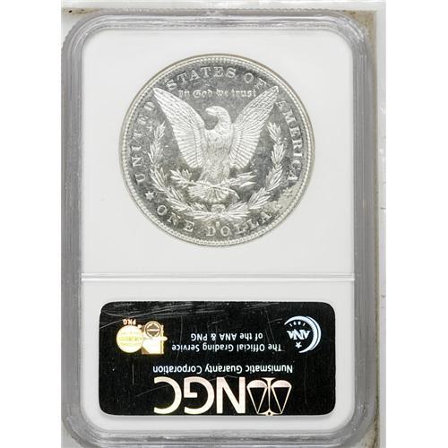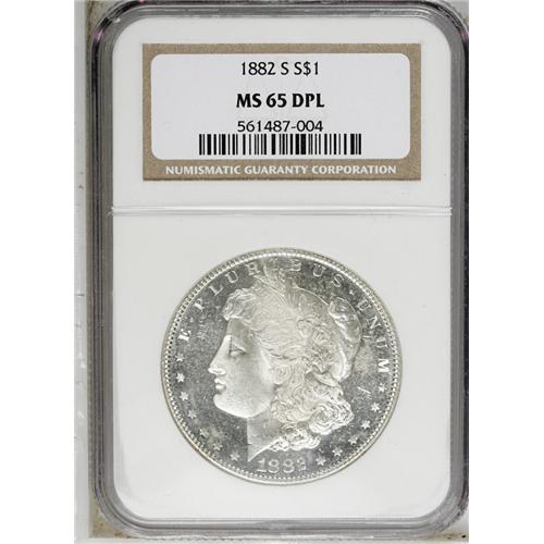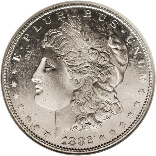 <B>1882-S<img border='0' src='http://www.heritagecoins.com/images/star.gif' width=10 height=10>$1> MS65 Deep Mirror Prooflike NGC.</B></I> A flashy and deeply reflective example with plenty of eye appeal. The moderately frosted devices and the brilliant fields create elegant contrast, though this also amplifies the small marks that appear in the fields. NGC has certified only eight finer Deep Mirror Prooflike pieces (7/06).
