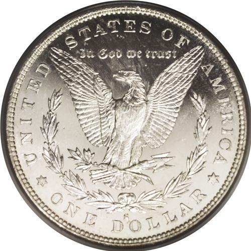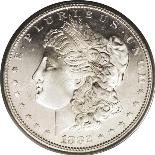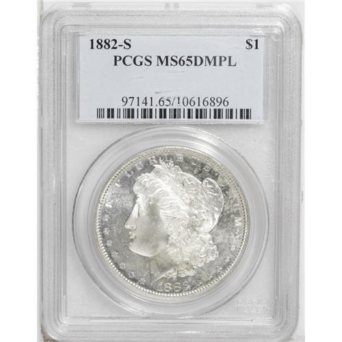 <B>1882-S<img border='0' src='http://www.heritagecoins.com/images/star.gif' width=10 height=10>$1> MS65 Deep Mirror Prooflike PCGS.</B></I> The 1882-S is one of the best produced, if not <I>the</B></I> best produced Morgan dollar. The mint luster is always exceptional and the striking details are invariably full. This is a beautiful deeply mirrored coin, struck from heavily basined dies, that shows thick mint frost over the devices. The brilliant finish shows a few faint, hazy spots on the right side of the obverse. Population: 30 in 65, 8 finer (8/06).