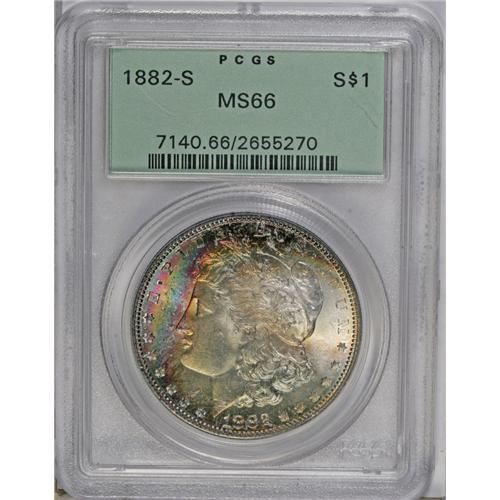 1882-S S$1 MS66 PCGS. A vivid arc of rainbow iridescen