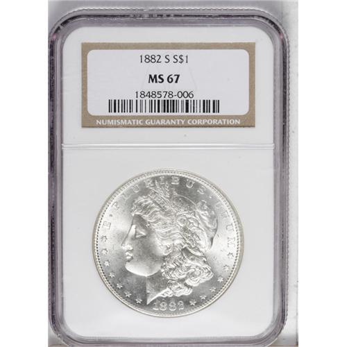 1882-S S$1 MS67 NGC. Fully struck throughout, the surf