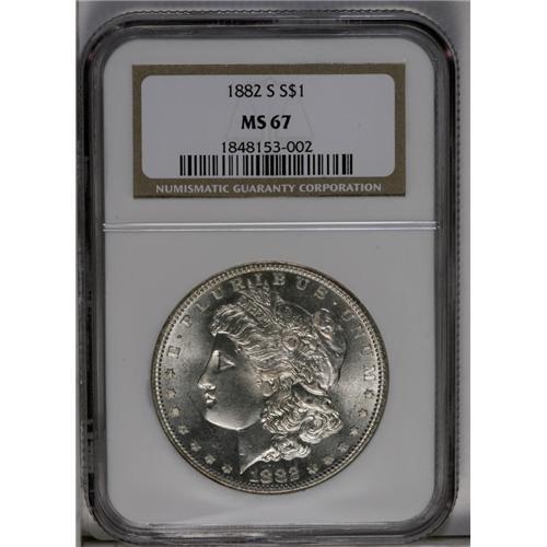 <B>1882-S<img border='0' src='http://www.heritagecoins.com/images/star.gif' width=10 height=10>$1> MS67 NGC.</B></I> Impeccable quality and appearance that really must be seen to be truly appreciated. Creamy luster abounds on untoned surfaces. A tiny spot of blue and russet color is seen at 8 o'clock on the reverse rim.