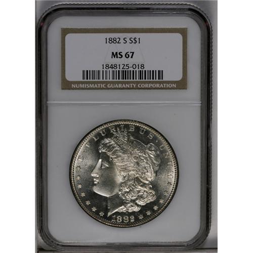 <B>1882-S<img border='0' src='http://www.heritagecoins.com/images/star.gif' width=10 height=10>$1> MS67 NGC.</B></I> This Superb Gem has outstanding luster with excellent eye appeal. Both sides are sharply struck and fully brilliant with a hint of lilac confined to the extreme obverse and reverse borders.