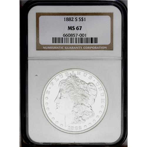 <B>1882-S<img border='0' src='http://www.heritagecoins.com/images/star.gif' width=10 height=10>$1> MS67 NGC.</B></I> Virtually untoned surfaces offer a nice contrast between the semi-reflective fields and motifs when the coin is tilted beneath a light source. A sharp strike is seen on the design elements, including relative strong definition in the hair curl above Liberty's ear and on the eagle's breast feathers. A couple of trivial marks on each side do not distract in the least. Light die striations are noted in the fields. NGC has seen 40 pieces grading higher (3/06). <BR><BR><B>Important notice:</B> Heritage usually auctions material at the rate of 200-250 lots per hour. On some occasions eBay Live bid software or the Internet may not be able to keep up with the pace of the auction. We recommend placing a realistic absentee bid now as insurance to avoid disappointment. Occasionally the auctioneer may eliminate or reject an eBay Live bid, and the auctioneer may also reopen a lot after the close of the eBay live bidding (usually because we missed an audience bid), and may reject your bid even if it shows you as the winning bidder. By bidding via eBay Live, you agree that Heritage may award the lot to another bidder at its sole discretion under the circumstances described above or any other reasonable circumstances. Since eBay bids are not shown to us until we open the lot on the floor, we treat those bids just like floor bids. In most cases the floor responds before the eBay bid is presented to us, due to Internet lag time, so for consistency we have made it a policy that floor bids are always considered first over tie eBay live bids. Also please note that all Heritage lots purchased through eBay Live carry a 20% Buyer's Premium. Please make sure you read the Terms and Conditions before you bid. This lot is being auctioned in conjunction with a live floor auction by Heritage Galleries & Auctioneers. All final auction and invoice information will be supplied by Heritage Galleries & Auctioneers, and all other information should be considered preliminary. Lot:3355 <BR><BR><B>Winning Notification and Billing:</B> After the FINAL session in this auction is complete, Heritage will send e-mail and snail mail invoices. This process normally takes several days. All final auction and invoice information will be supplied by Heritage Galleries & Auctioneers, and all other information should be considered preliminary. <BR><BR>This auction will be conducted on a live auction floor and over the Internet through eBay Live. If you choose to place an absentee bid, please take a moment to <font color='#0000ff'><u><a href='http://pages.ebay.com/liveauctions/help/before/laabsentee.html'>learn how eBay Live absentee bidding works</a></u></font><font color='#000000'>