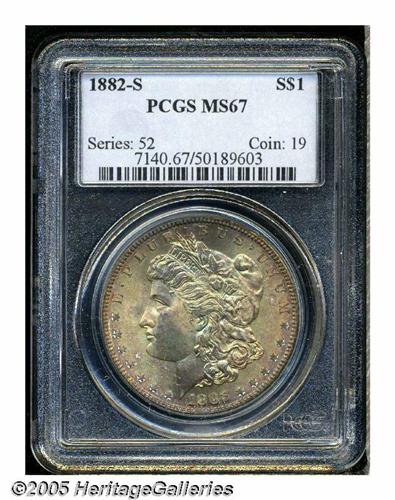 <B>1882-S<S$1> MS67 PCGS.</B></I> A rich coating of russet-red, gold, and sea-green toning covers the obverse, while the bright, sparkling reverse is brilliant, except for a narrow band of lovely golden peripheral toning. Both sides are exquisitely preserved and nearly pristine. A truly beautiful Superb Gem.
