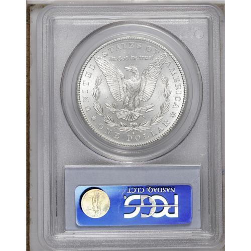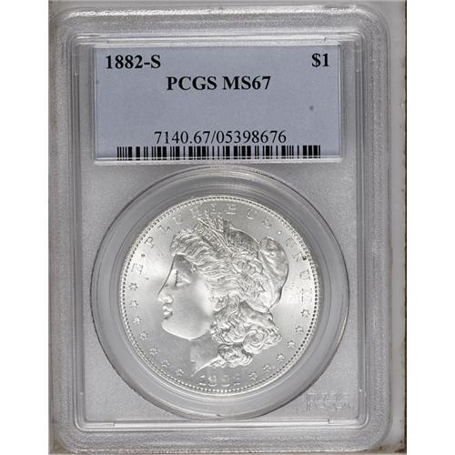 <B>1882-S<img border='0' src='http://www.heritagecoins.com/images/star.gif' width=10 height=10>$1> MS67 PCGS.</B></I> An absolutely Superb example of the Morgan dollar type. Fully untoned with watery, semi-reflective fields and dazzling cartwheel luster on both sides. A couple of trivial milling marks, on the reverse, arguably preclude an even loftier grade assessment from PCGS.