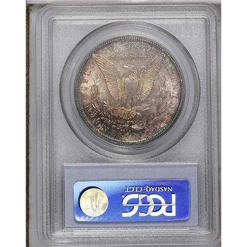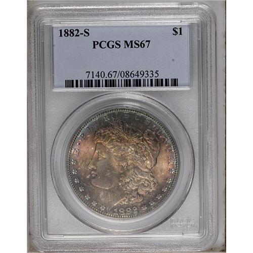 <B>1882-S<img border='0' src='http://www.heritagecoins.com/images/star.gif' width=10 height=10>$1> MS67 PCGS.</B></I> Superb quality overall with intense mint luster and nearly mark-free surfaces. The deep original toning on both sides of this piece must be seen to be believed. Amber-mauve, purple-rose, and cobalt-blue colors compete for visual attention. A great coin for the connoisseur of rich, original patina.