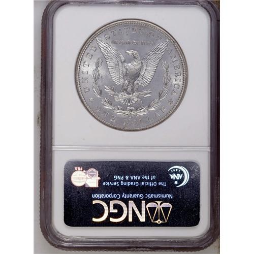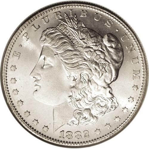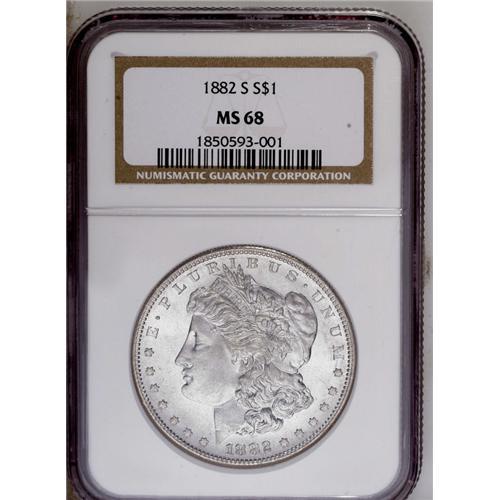 <B>1882-S<img border='0' src='http://www.heritagecoins.com/images/star.gif' width=10 height=10>$1> MS68 NGC.</B></I> The San Francisco Mint dollars of 1880, 1881, and 1882 in high grades represent the archetype of what Superb Gem Morgan dollars ought to look like. However, of the three issues in MS68, the 1880-S is the most obtainable, the 1881-S somewhat less so, and the 1882-S considerably scarcer. This example shows dancing, superb cartwheel luster that does not even require "flashing" or rotation of the coin to show its splendor! The surfaces are incredibly brilliant, with a mere tinge of gold at the rims and some moderate prooflikeness on the reverse, and free of all but the most trivial contact. Unimprovable at either service. Census: 44 in 68, 0 finer (6/06).