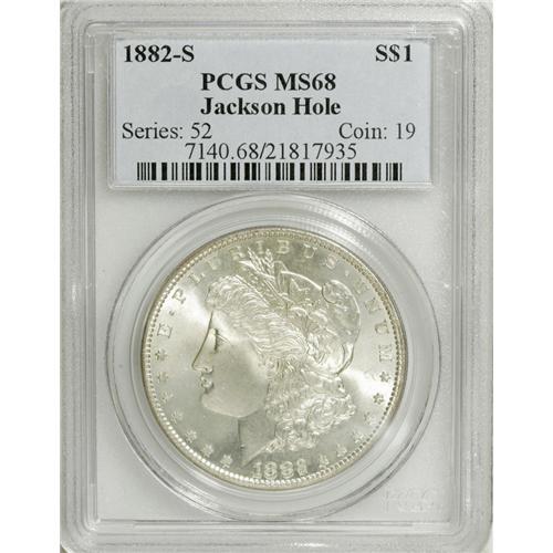 <B>1882-S S$1 MS68 PCGS.</B></I> Ex: Jackson Hole. The superlative quality of this conditionally rare piece is evident at first glance, and close examination of the coin only confirms this initial impression. The design elements are beautifully rendered on both sides, with pinpoint sharpness evident down to the last detail. An arc of orange-tan color resides near the upper reverse periphery, but the surfaces are otherwise untoned. Under magnification, a few tiny nicks and grazes can be found, but these are of no real concern. Incidentally, all four digits in the date exhibit die lumps and possible doubling, without matching the diagnostics of any currently known VAM. For the specialist in pursuit of the finest quality, this lovely example represents a significant opportunity.<BR><I>From The Jackson Hole Collection.</B></I><BR><BR><b>Shipping:</b> Coins & Currency (<a target="_blank" href="http://www.heritageauctions.com/common/shipping.php">view shipping information</a>)
