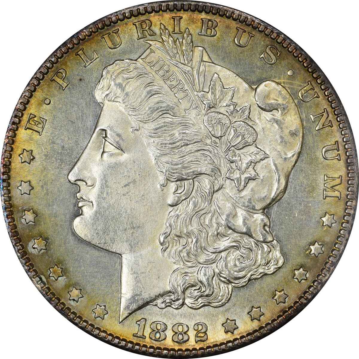 Central brilliance and peripheral iridescent peach-gold toning vie for the eye despite faint traces of a light cleaning. Sharply struck and virtually mark-free save for some hairlines. No doubling seen at any date numeral. PCGS #7140