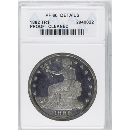 <B>1882 T$1 --Cleaned--ANACS. PR60 Details.</B></I> The boldly impressed devices have pleasing frost, though past cleaning has partly subdued the strong reflectivity of the fields. Each side has thin cerulean and tan-gold toning.<BR><BR><b>Shipping:</b> Coins & Currency (<a target="_blank" href="http://www.heritageauctions.com/common/shipping.php">view shipping information</a>)