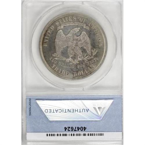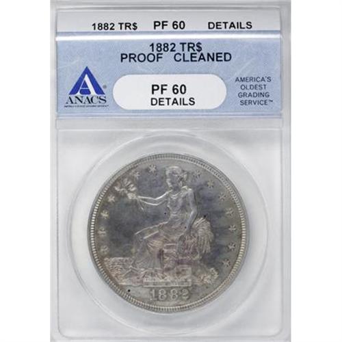 <B>1882 T$1 --Cleaned--ANACS. PR60 Details.</B></I> Predominantly silver-gray with light golden shadings over each side and small dots of charcoal patina in the fields. No trace of friction, though the fields show a number of hairlines from a past cleaning.<BR><I>Ex: Greater New York Numismatic Convention, (Stack's, 5/90), lot 1339.<BR>From The John Stimson, Sr. Collection, Part One.</B></I><BR><BR><B>Coin Engraver:</B> William Barber<BR><BR><b>Shipping:</b> Coins & Currency (<a target="_blank" href="http://www.heritageauctions.com/common/shipping.php">view shipping information</a>)