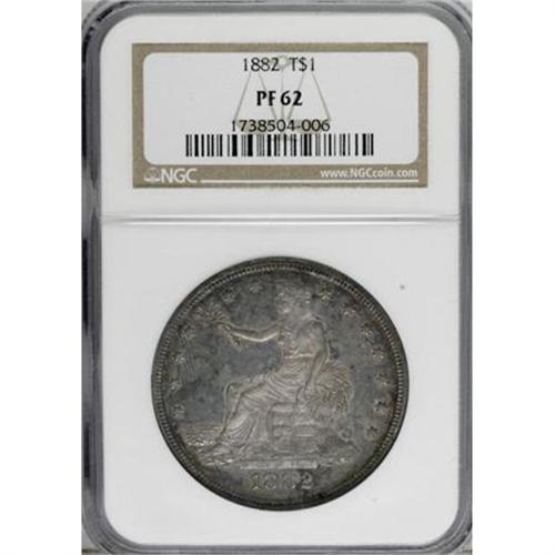 <B>1882 T$1 PR62 NGC.</B></I> This piece has deeply mottled blue, gray, and golden-rose coloration over each side. Richly toned with strong detail, though the fields have scattered hairlines and minor contact. A pleasing example of this proof-only issue.<BR><BR><b>Shipping:</b> Coins & Currency (<a target="_blank" href="http://www.heritageauctions.com/common/shipping.php">view shipping information</a>)