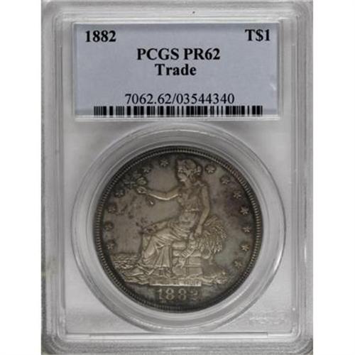 <B>1882 T$1 PR62 PCGS.</B></I> This proof-only representative exhibits irregular pastel golden-gray patina on the obverse, and deep smoky gray color on the reverse. Sharply struck, with no significant marks.<B><BR></B></I><I>From The Beau Clerc Collection.</B></I><BR><BR><B>Coin Engraver:</B> William Barber<BR><BR><b>Shipping:</b> Coins & Currency (<a target="_blank" href="http://www.heritageauctions.com/common/shipping.php">view shipping information</a>)