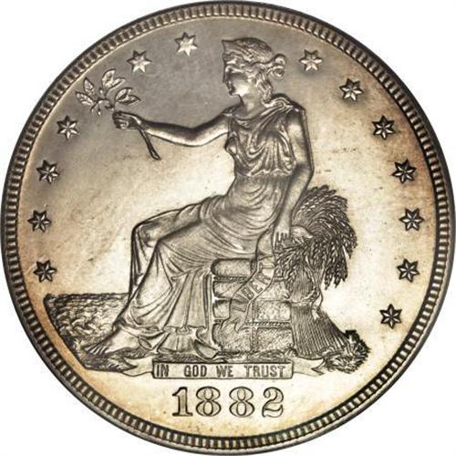 <B>1882 T$1 PR63 Cameo PCGS.</B></I> The 1882 is a scarce proof-only date, and specimens that show mentionable cameo contrast are only infrequently encountered. The reverse, in particular, has frosty devices and glassy fields. Nicely struck with only inconsequential blending of detail on Liberty's hair and the upper left stars. Population: 26 in 63, 32 finer (1/08).<BR><BR><b>Shipping:</b> Coins & Currency (<a target="_blank" href="http://www.heritageauctions.com/common/shipping.php">view shipping information</a>)