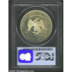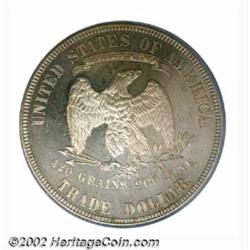 1882 T$1 PR64 Cameo PCGS. The 1882 continues the proof-only tradition started with Trade Dollars in 1879. Only 1,097 pieces were struck in this year. This piece is lightly toned throughout. The fields are very deeply mirrored and there is a noticeable bit of mint frost on the devices, quite enough to create a two-toned "white-on-black" appearance on each side. A spectacular coin, this would be a very impressive addition to a set of Trade Dollars. Population: 8 in 64, 1 finer (9/02). Important notice: We expect to be auctioning lots at the rate of 200-250 per hour. Sometimes eBay Premier live bid software cannot keep up with that pace, so we strongly recommend that you place a realistic proxy bid now as insurance to avoid disappointment. Also please note that all Heritage/CAA lots purchased through eBay Premier carry a 20% Buyer's Premium. Please make sure you read the Terms and Conditions.