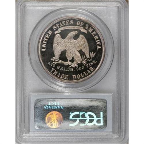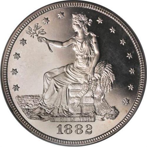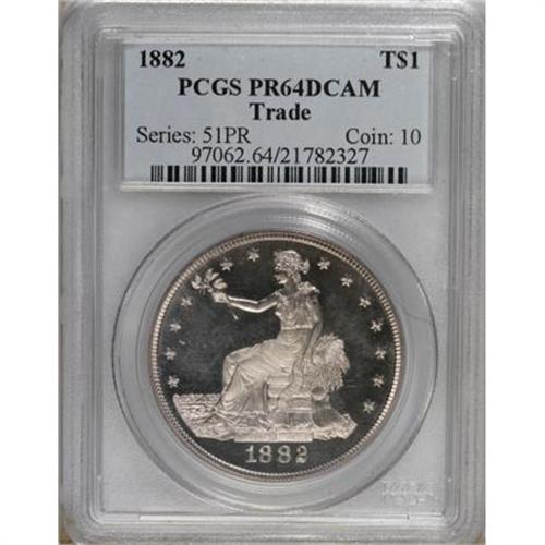 <B>1882 T$1 PR64 Deep Cameo PCGS.</B></I> The proof-only 1882 Trade dollar had the fourth-highest proof mintage in the series, at 1,097 pieces, and is a relatively common date overall. With the Cameo designation, it becomes scarce, and it is scarcer still in Deep Cameo Condition. This near-Gem is fully struck, with intense white-on-black contrast noted on both sides. The inky-black fields display particularly noteworthy depths of reflectivity. A few wispy hairlines limit the grade. Population: 5 in 64 Deep Cameo, 9 finer (6/07).<BR><BR><b>Shipping:</b> Coins & Currency (<a target="_blank" href="http://www.heritageauctions.com/common/shipping.php">view shipping information</a>)