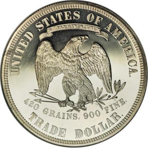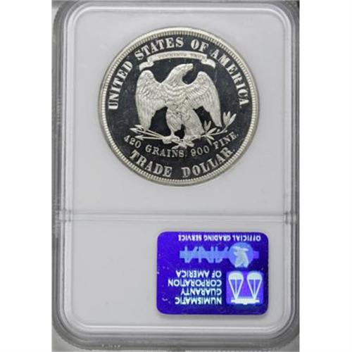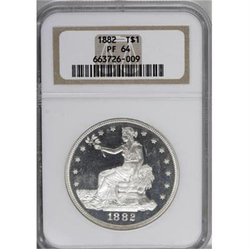 <B>1882 T$1 PR64 NGC.</B></I> Stunning black-and-white cameo surfaces are the hallmark of this numismatic prize. Thick mint frost covers the devices, and the mirrored fields are blindingly deep. On its own the reverse would easily qualify for a Gem grade, but the obverse shows a small area of contact marks in the left obverse field that apparently precluded a finer grade. Nonetheless a beautiful piece, with just a hint of gold toning near the rims.<BR><BR><B>Coin Engraver:</B> William Barber<BR><BR><b>Shipping:</b> Coins & Currency (<a target="_blank" href="http://www.heritageauctions.com/common/shipping.php">view shipping information</a>)