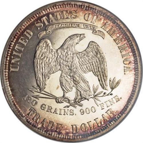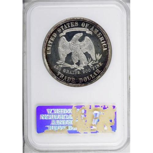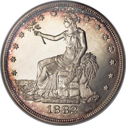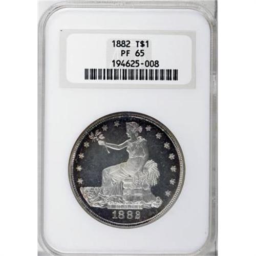 <B>1882 T$1 PR65 NGC.</B></I> Cherry-red and jade-green adorn the peripheries of this exactingly struck and flashy Gem. The devices are icy and clearly provide cameo contrast, but the former generation holder predates the Cameo designation for Trade dollars. An eagerly pursued proof-only date.<BR><BR><B>Coin Engraver:</B> William Barber<BR><BR><b>Shipping:</b> Coins & Currency (<a target="_blank" href="http://www.heritageauctions.com/common/shipping.php">view shipping information</a>)