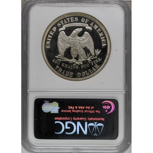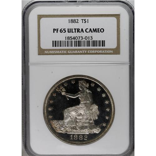 <B>1882 T$1 PR65 Ultra Cameo NGC.</B></I> The early 1880s saw a limited production of trade dollars in proof format struck exclusively for collectors. Many of these proofs were poorly handled, with the result that few have survived in Gem quality. This example is one of those that did manage to survive in high grade for more than 100 years. The only blemish worth noting is a small disturbance by the D of UNITED. It is a brilliant Gem with faint peripheral gold toning limited to the obverse. The fields are deeply mirrored with fully lustrous and frosty devices as expected for the Ultra Cameo designation. Census: 3 in 65 Ultra Cameo, 13 finer (3/07).<BR><BR><b>Shipping:</b> Coins & Currency (<a target="_blank" href="http://www.heritageauctions.com/common/shipping.php">view shipping information</a>)