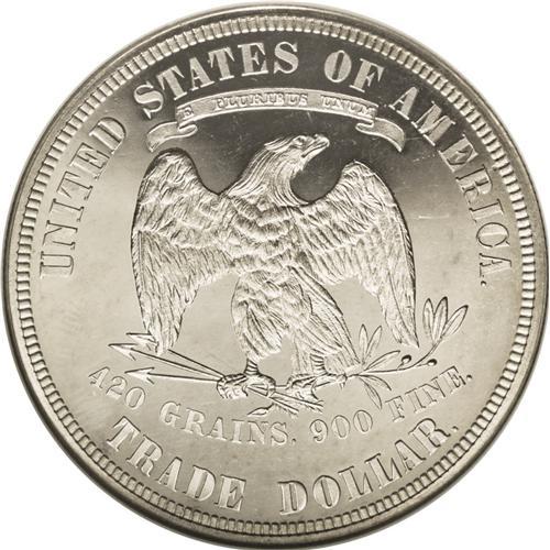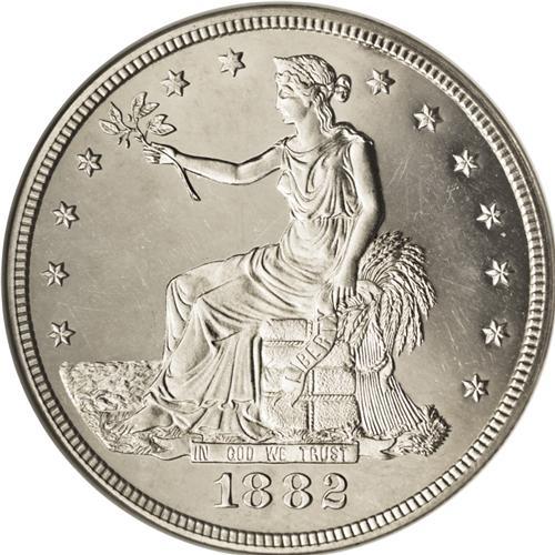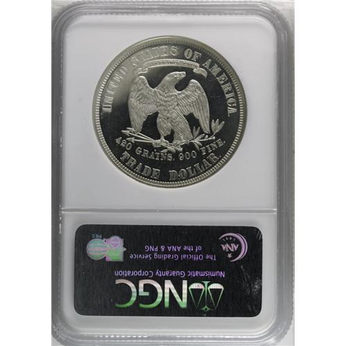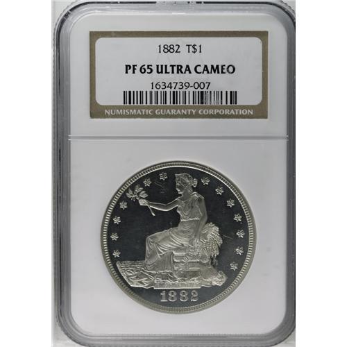 <B>1882<T$1> PR65 Ultra Cameo NGC.</B></I> The eye appeal is nothing short of breathtaking on both sides of this heavily contrasted Gem. The frosty-white devices rise powerfully above the deeply mirrored fields with nearly complete striking definition. There is no toning, and the surfaces are expectantly distraction-free for the assigned grade. A squiggly lintmark in the obverse field before Liberty's torso is noted. Despite a proof-only mintage of just 1,097 pieces, the 1882 is among the more readily available Trade dollars at the finer levels of preservation. Census: 3 in 65 Ultra Cameo, 13 finer (7/06).<BR><I>From The Mulholland Collection.</B></I>