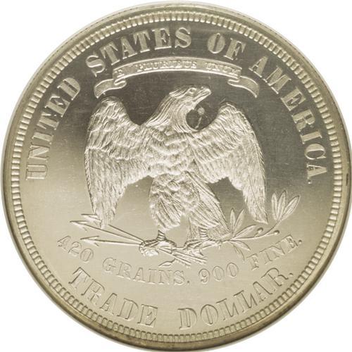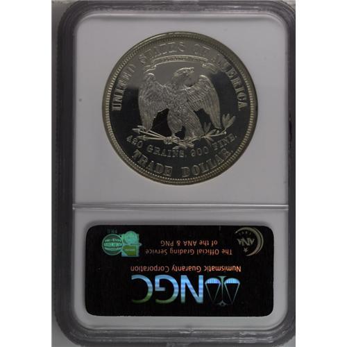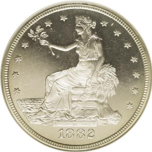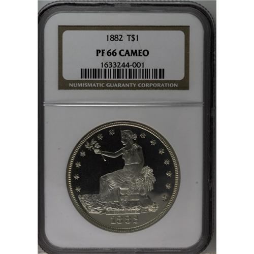 <B>1882<T$1> PR66 Cameo NGC.</B></I> Sparkling mint brilliance allows full appreciation of the two-toned effect and nearly flawless surface quality seen on this piece. The fields show unfathomable depth of mirrored reflectivity which sets up a "black" background against the white frosted finish that covers the devices. The only flaws we see on this pristine example are weakness of strike on stars 5 and 6, and a small spot of granularity in the planchet below the eagle's beak. Census: 11 in 66 Cameo, 3 finer (7/06).