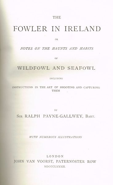 Van Voorst, London 1882, 503ppThe fowler in Ireland; or, Notes on the haunts and habits of wildfowl and seafowl including instructions in the art of shooting and capturing them Beautifully illustrated. A sought-after book.