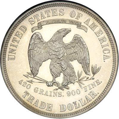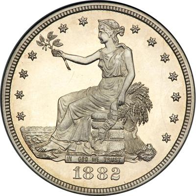 1882 Trade Dollar. NGC graded Proof 65 Ultra Cameo. Only 1,097 pieces struck in this proof only year. A gem brilliant white example with excellent cameo contrast. The Philadelphia Mint's Proof-only delivery of 1882 Trade Dollars found a fair number of buyers for those days, but compared to modern standards it is very scarce. The 1882 Proof is not as well preserved as one might expect given the circumstances of its issue due to years of neglect and cleaning by collectors and dealers up to the advent of third-party grading in the mid-1980s. PCGS is always very careful when grading these, and bidders can count on a Proof 65 being squarely in the Gem class with no compromises to quality. This glittering representative is a bright, attractive "ultra" cameo on both sides. Fully struck with the look of an even higher grade. Pop 4; 15 finer, 1 in 65 star, 7 in 66, 2 in 66 star, 4 in 67, 1 in 68.