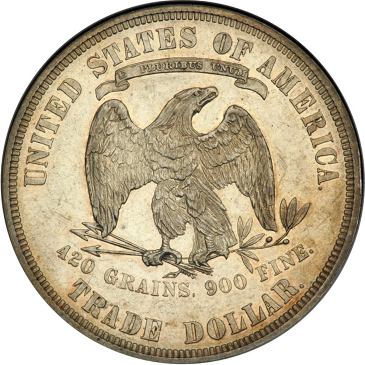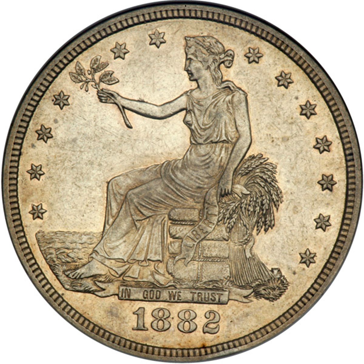 1882 Trade Dollar. NGC graded Proof 58. A slightly circulated example of this proof only year. A total of 1,097 coins struck. By the later-1870s, it became clear to everyone except congressmen that America's Trade Dollar experiment was a failure. Many of these non-monetized coins remained at home instead of circulating abroad, as had been the primary intent. This caused untold grief to workers and small businessmen. Eventually, the wheels of congress began turning: after 1878, only Proofs were struck, exclusively for collectors. And finally, in 1887, our "Coconuts on the Hill" (as H. L. Mencken called these erstwhile DC. gentlemen) put an end to the Trade Dollar experiment.