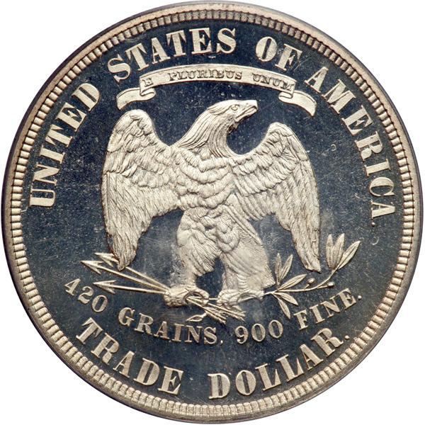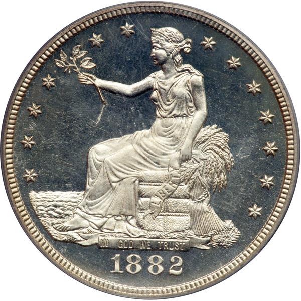 1882 Trade Dollar. PCGS graded Proof 64 Deep Cameo. Trade. Fully white and well struck. A small flaw on the obverse under the branch. A satiny silver bright specimen with faint zephyr-like wisps of frosted iridescence on both main devices set against the deeper mirror pools that surround. Very sharply struck for the date, as expected, since the Mint made every effort to produce high-quality Proofs in the 1880s, certainly much finer than pre-1878 business strike issues made for everyday commerce in terms of design clarity. Pop 9; 14 finer, 10 in 65DCAM, 4 in 66DCAM (PCGS # 97062) .
