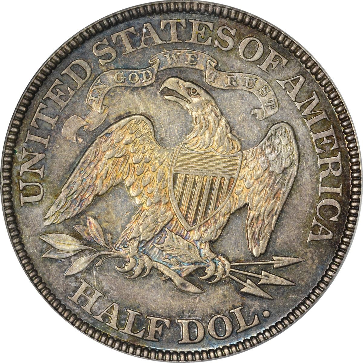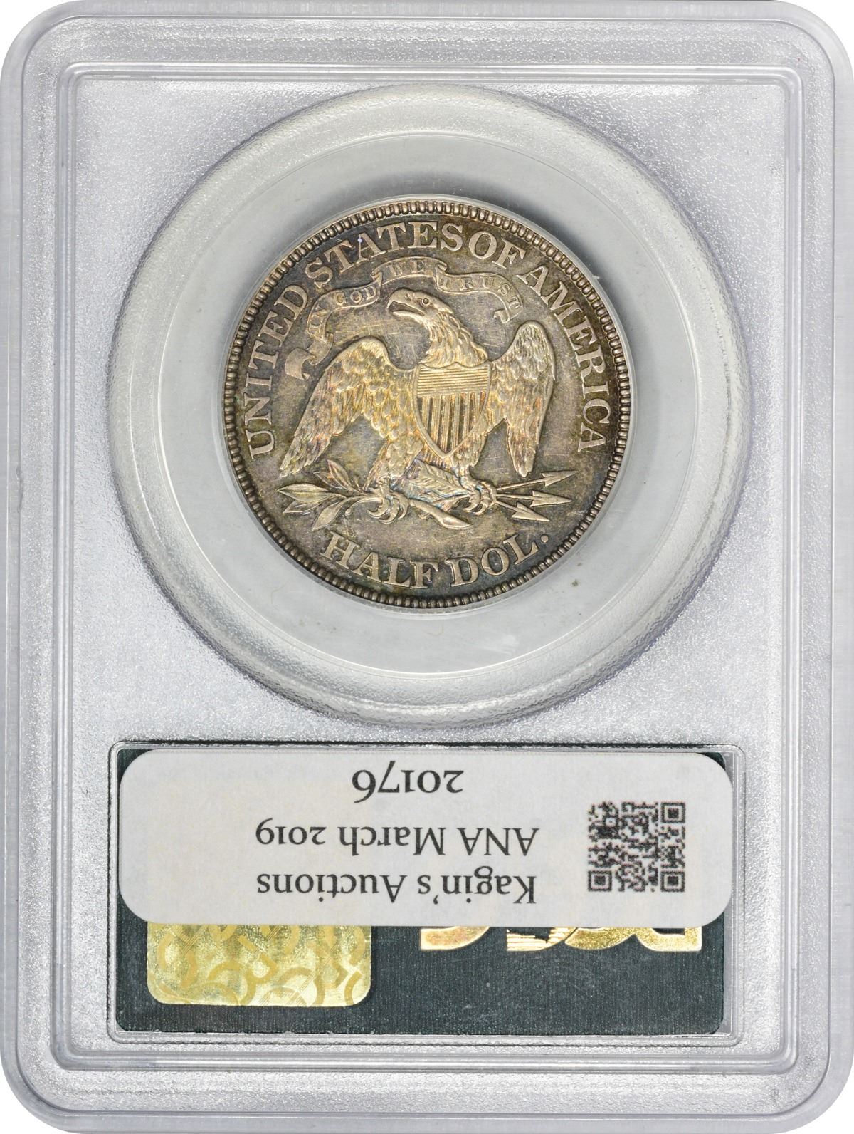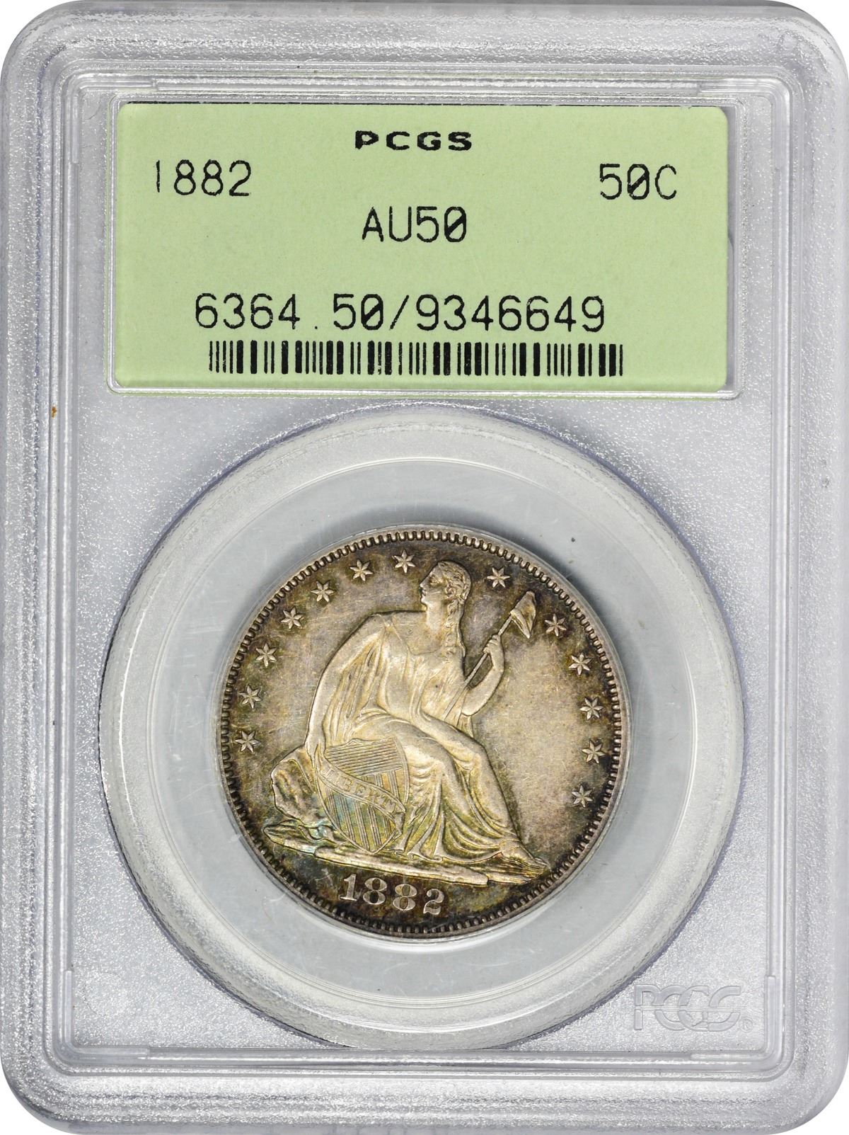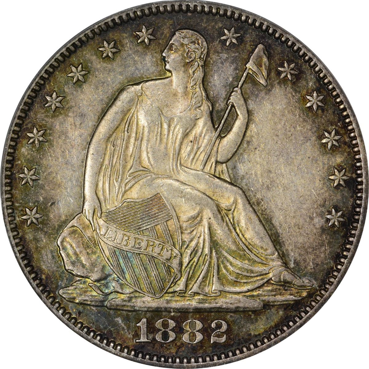 Undeniably choice for the grade, with or without a loupe, and a sharp and appealing coin throughout. The frosty silver-gray centers yield quickly to a palette of blue, rose, gold, and crimson iridescence, especially in the protected areas. Other than some nominal hairlines, this specimen fared well during its brief stay in pocket change. Two tiny lines in the dentils below the existing date account for the variety attribution. One of 5,500 examples of the date struck for circulation purposes, though few actually saw commercial use -- well-circulated examples of the date are scarcer than high-grade pieces in today’s hobby. A lot of coin for the grade. Housed in an older-style green label PCGS holder with frame. PCGS #6364