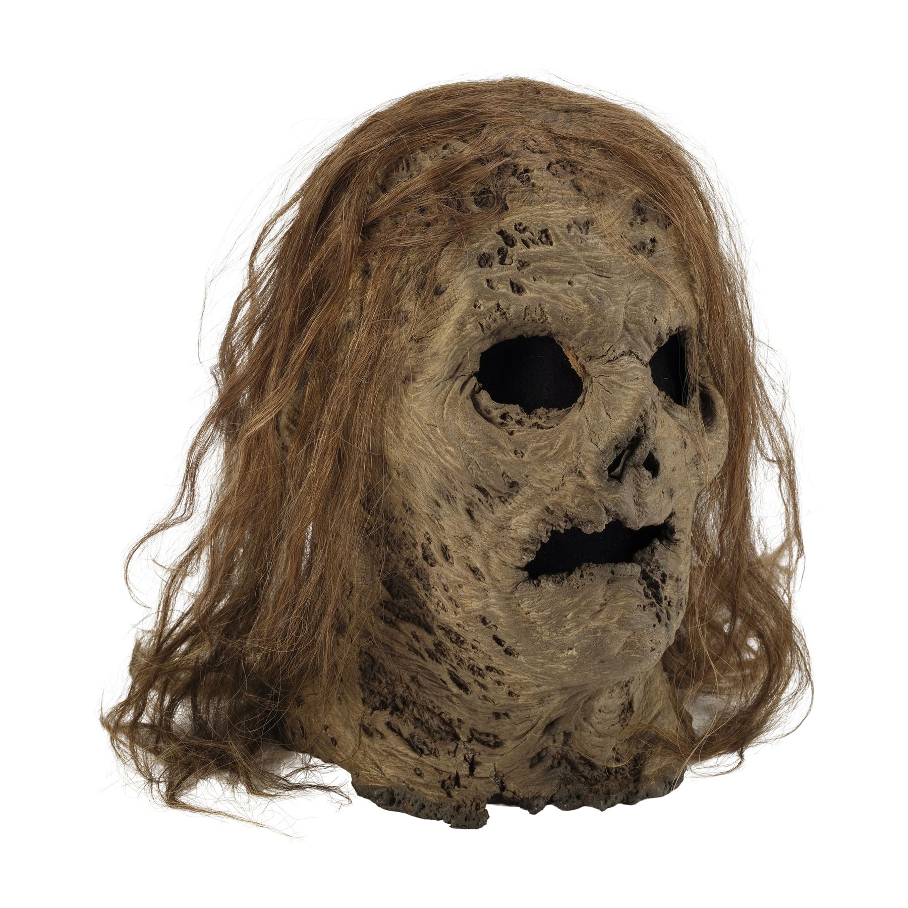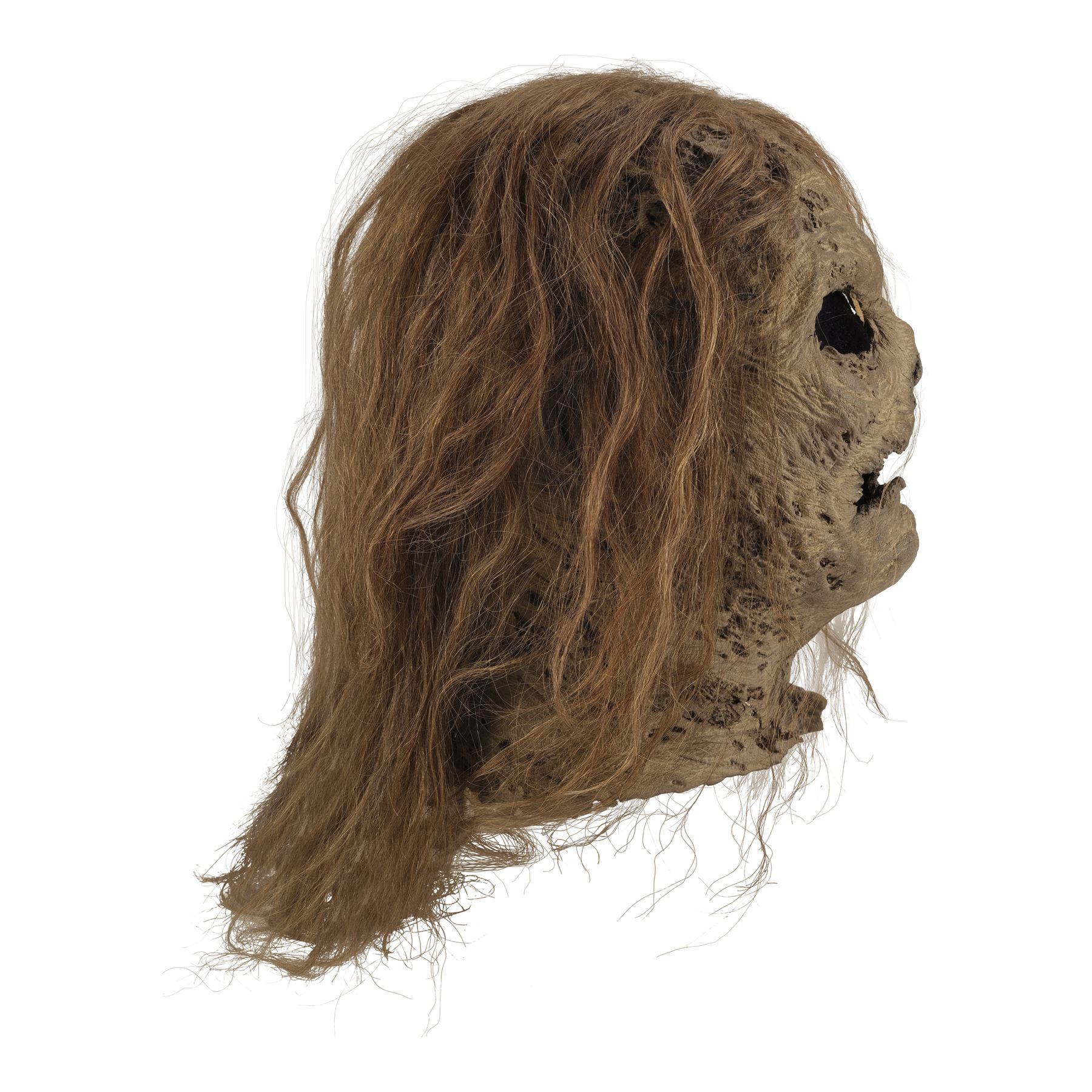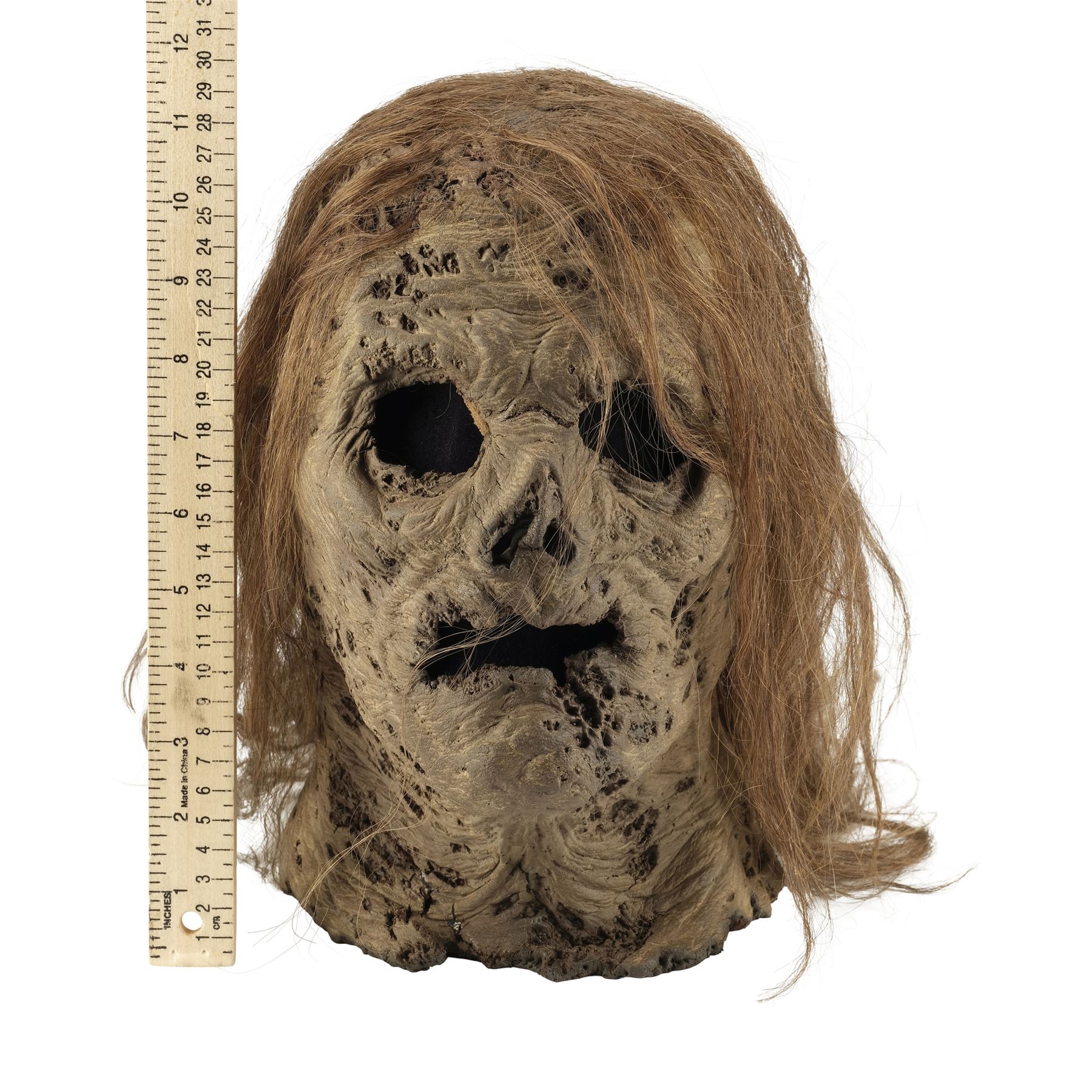 This lot consists of a highly-detailed foam latex mask replicating rotted gray skin, meant to appear tanned like leather, with light brown hair punched throughout the scalp and a black foam mannequin head for display. The foam latex exhibits some drying and cracking.