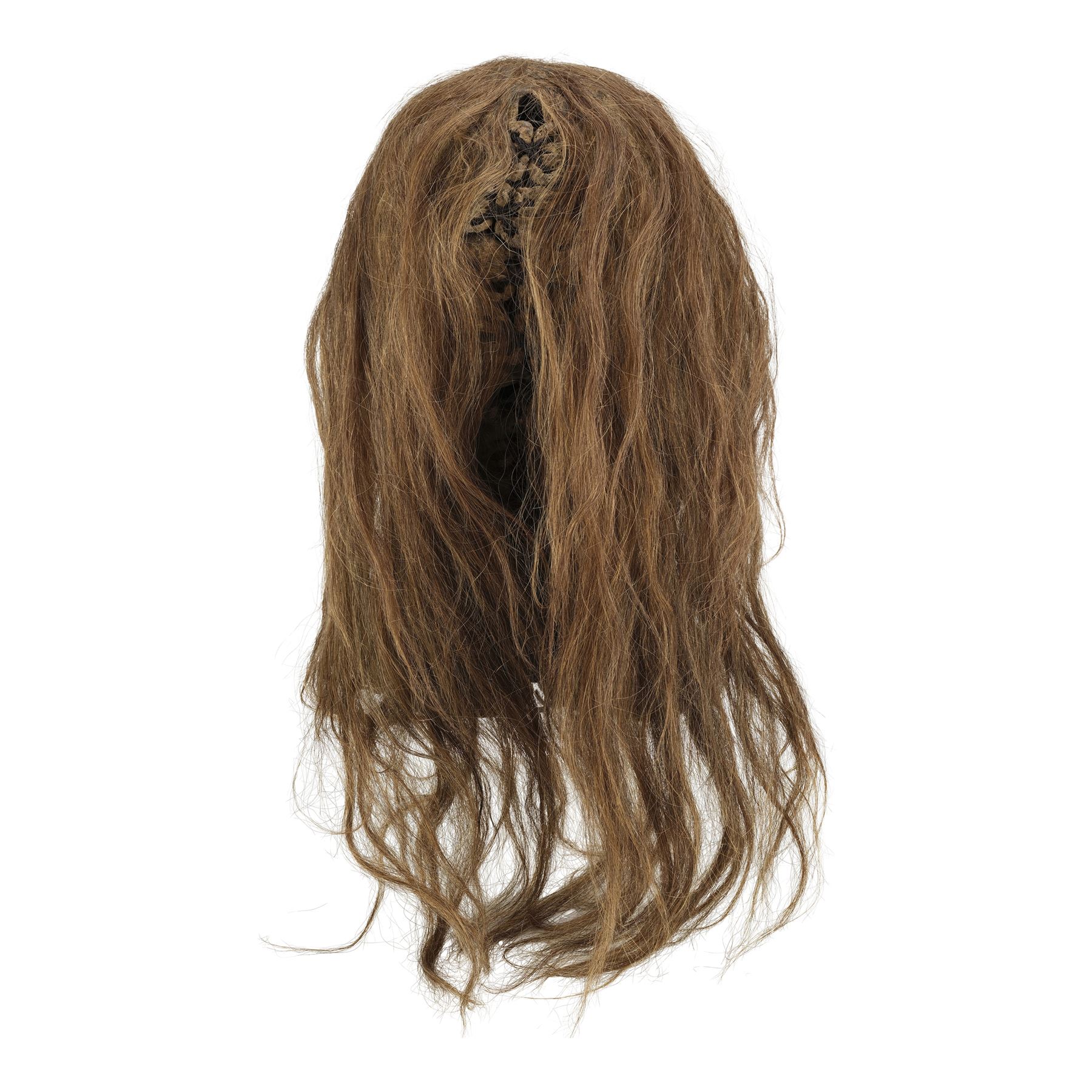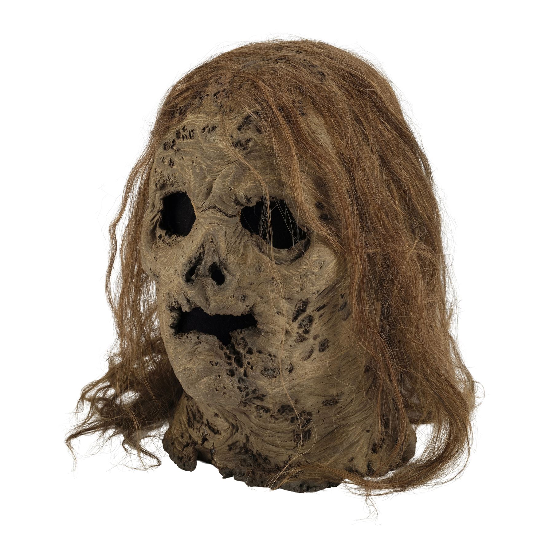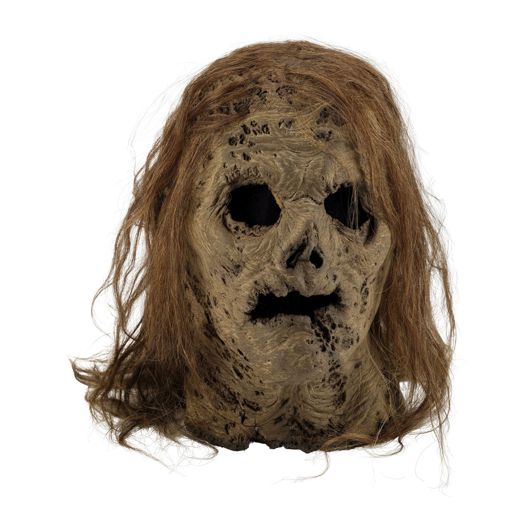 This lot consists of a highly-detailed foam latex mask replicating rotted gray skin, meant to appear tanned like leather, with light brown hair punched throughout the scalp and a black foam mannequin head for display. The foam latex exhibits some drying and cracking.