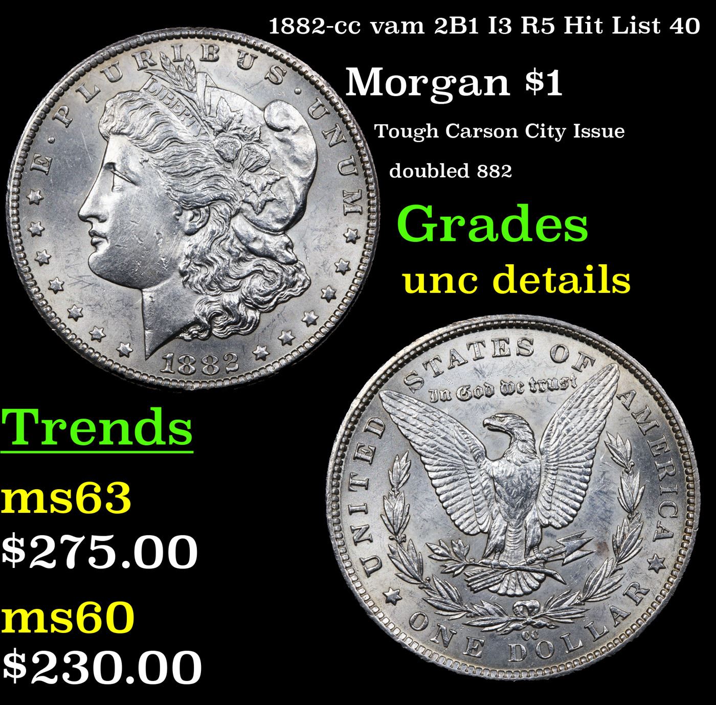 1882-cc vam 2B1 I3 R5 Hit List 40 Morgan Dollar $1 Grades Unc Details.