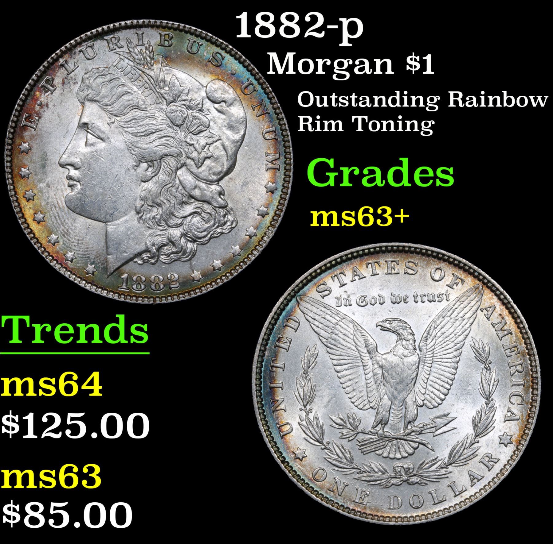 1882-p Morgan Dollar $1 Grades Select+ Unc. Outstanding Rainbow Rim Toning A Corey's Pick