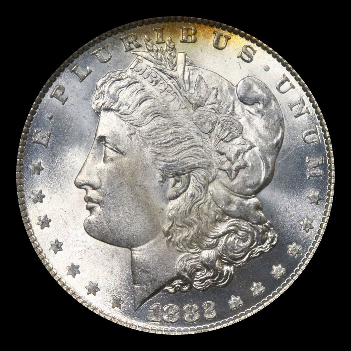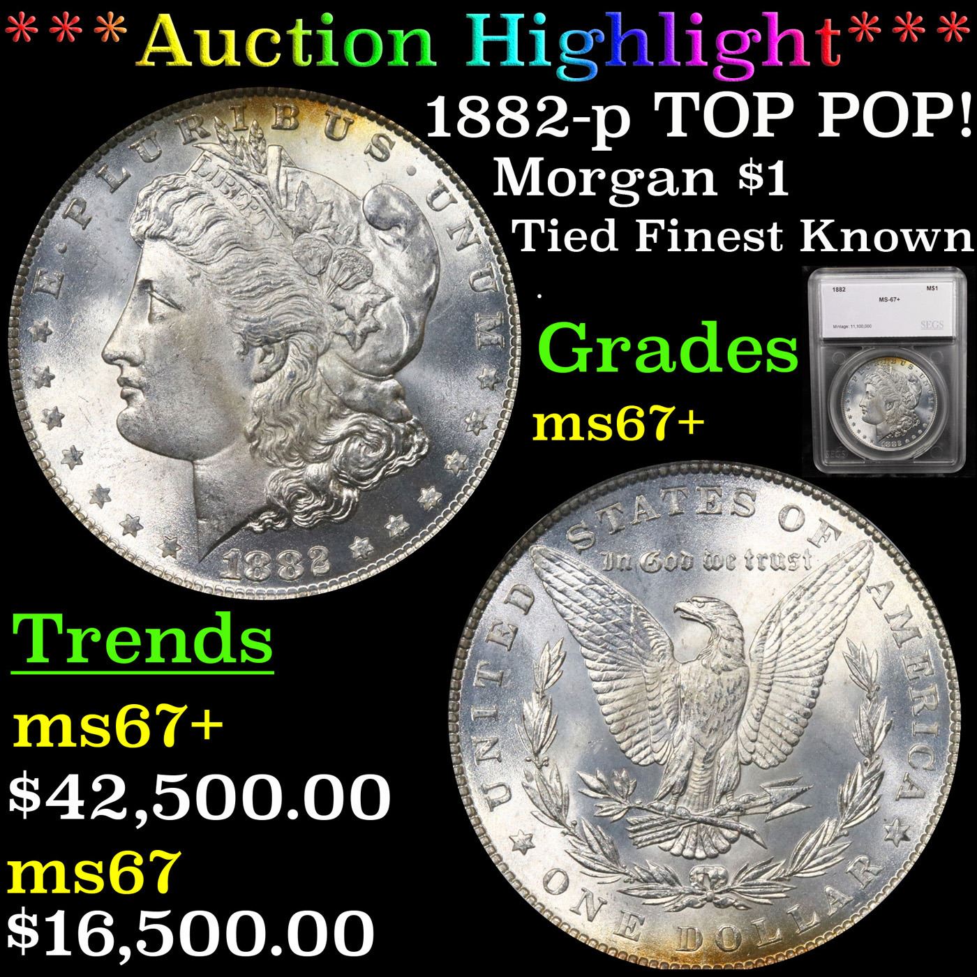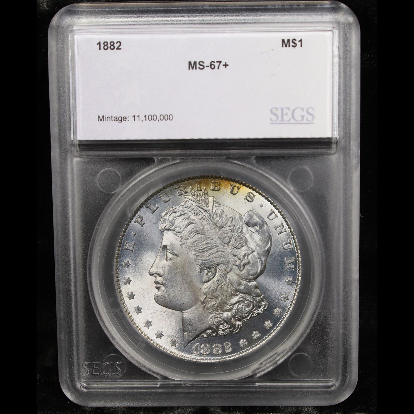 1882-p TOP POP! Morgan Dollar $1 Graded ms67+ BY SEGS. he 1882 Morgan dollar claims a large mintage of more than 11.1 million pieces. Many coins were held in government storage and released in large numbers in later years. As a result, the 1882 is an available issue in Mint State grades, but many examples were struck from overused dies and show weak striking characteristics. The issue is a condition rarity at the MS67 grade level. This Plus-graded Superb Gem is a magnificent specimen, with sharply detailed design elements throughout and virtually flawless brilliant surfaces. Vibrant mint luster adds to the terrific eye appeal. A Corey's Pick, Bid to Win, Don't let it get Away, you might not find its equal Coin. I give this coin my highest recommendation