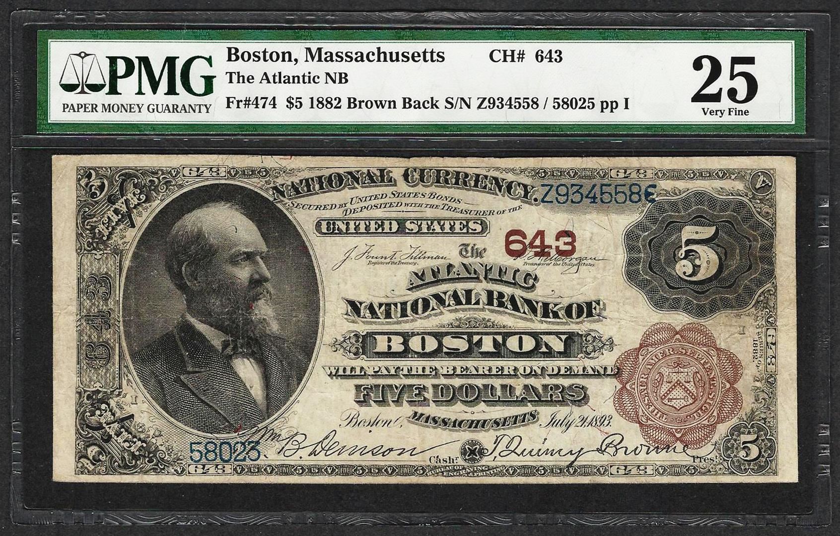 One 1882BB $5 Atlantic NB Boston, MA CH# 643 National Currency Note PMG Very Fine 25. PMG Certified.