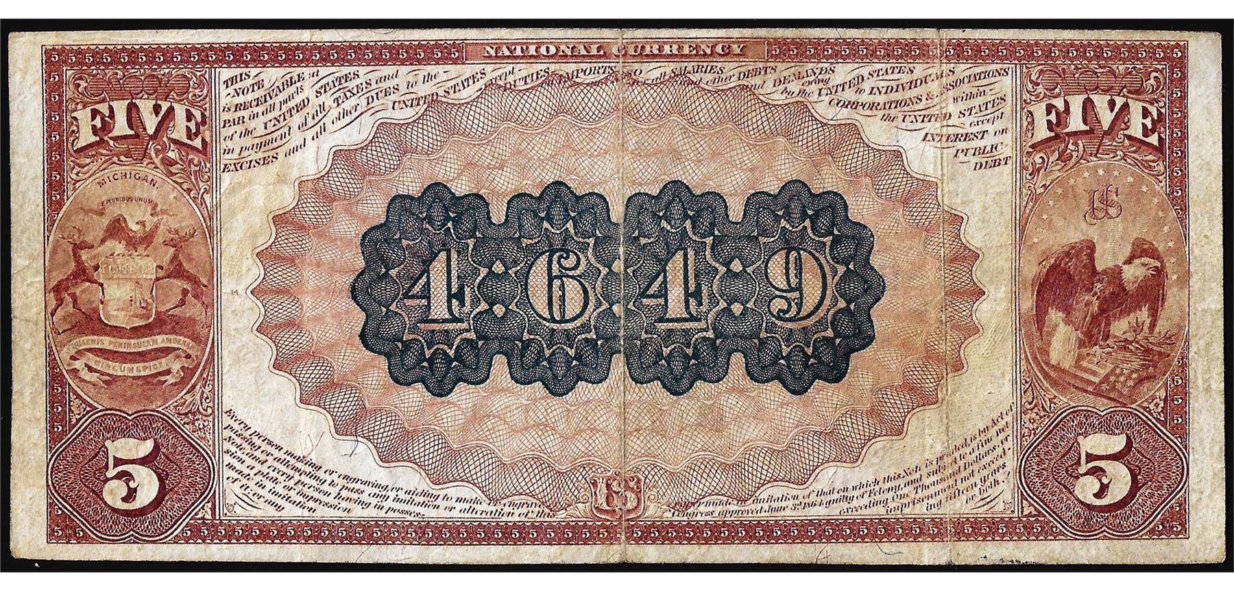 One 1882BB $5 First National Exchange Bank of Plymouth, MI CH# 4649 National Currency Note.