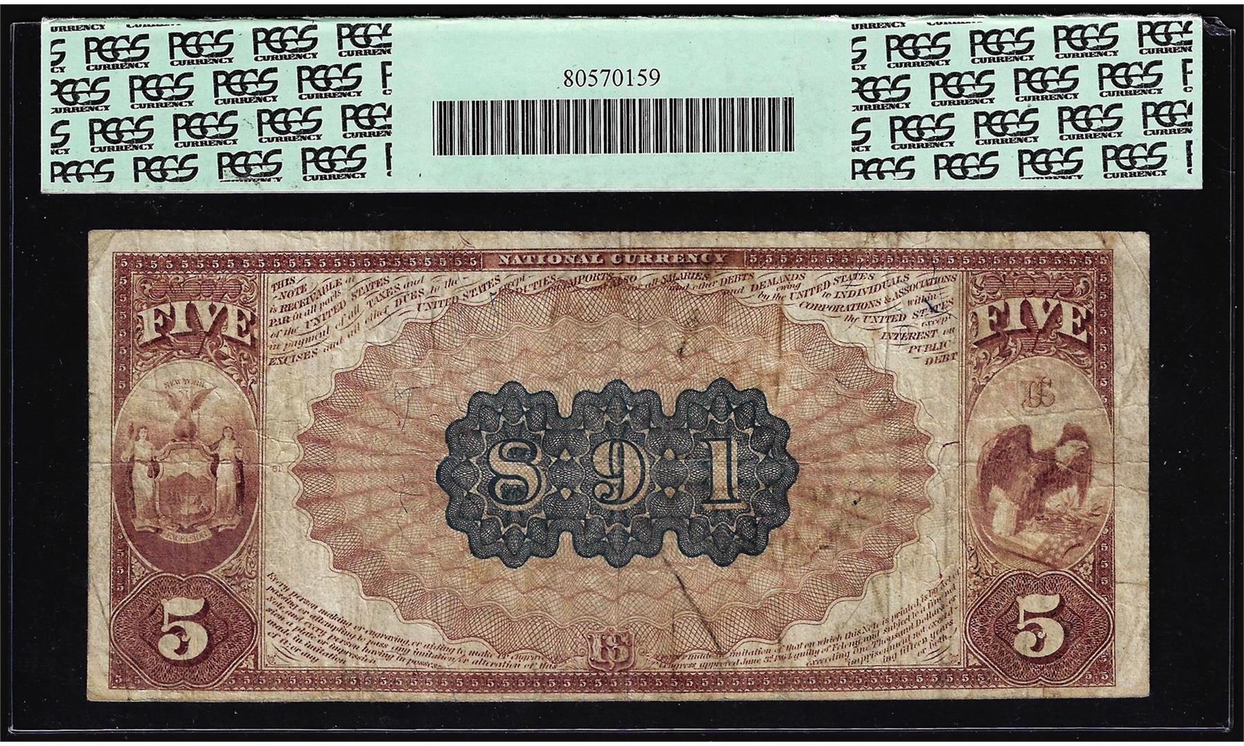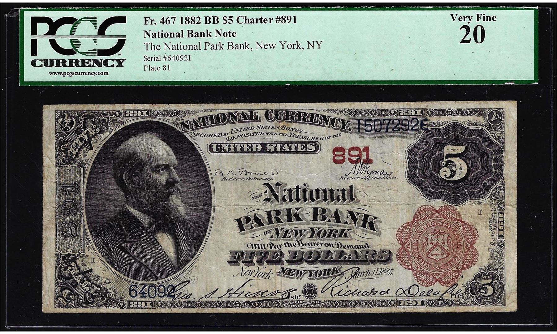 One 1882BB $5 Park Bank of New York, NY CH# 891 National Currency Note PCGS Very Fine 20. PCGS Graded.