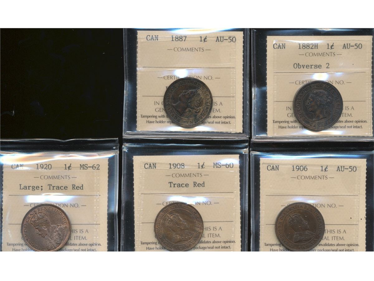 1882H 1¢ Obv 2, 1887, 1906 AU50, 1908 MS60 & 1920 Lg MS62. Lot of 5 coins all ICCS graded.