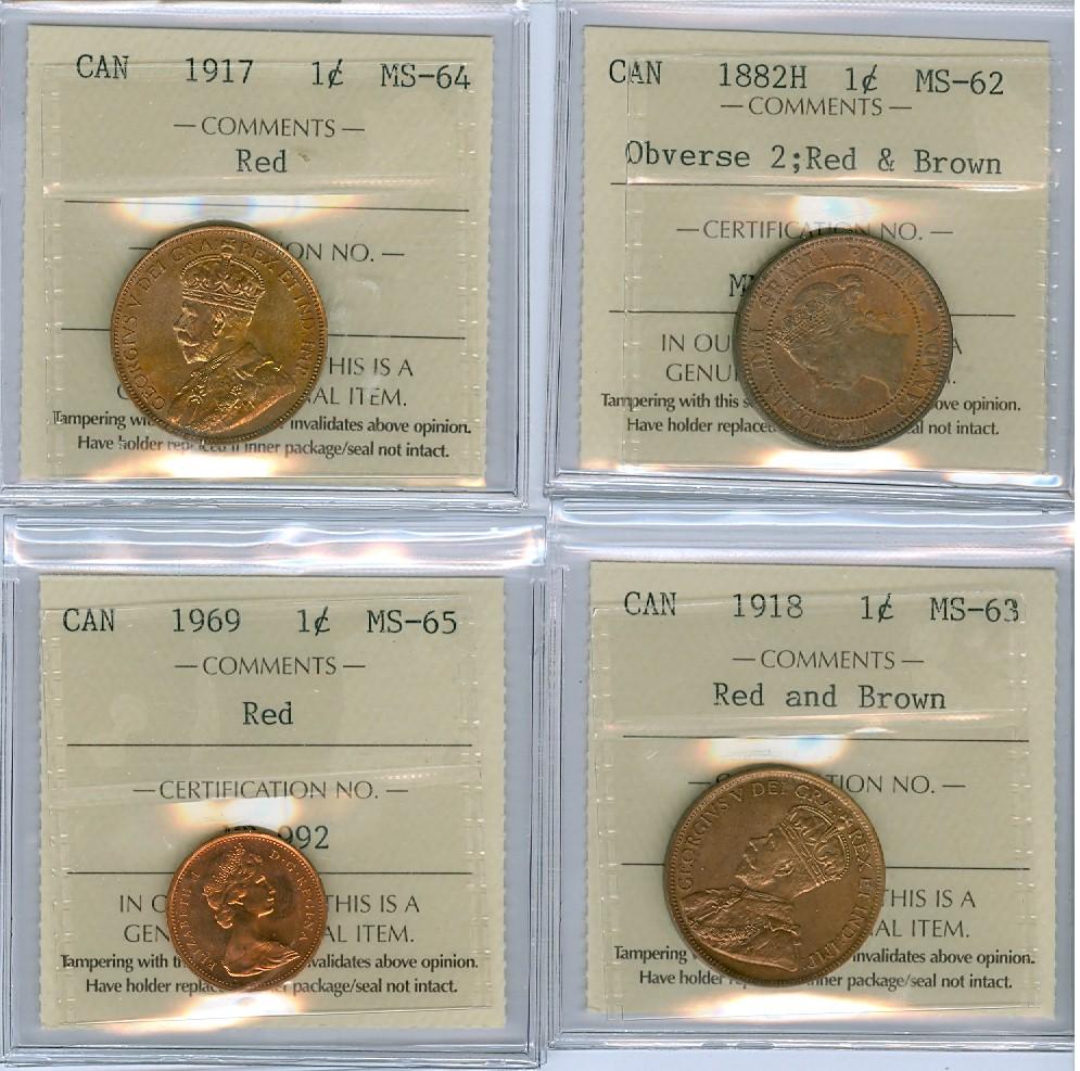 1882H 1¢ Obv2 MS62RB, 1917 MS64RD, 1918 MS63RB and 1969 MS65RD. Lot of four 1¢ pcs all ICCS graded.