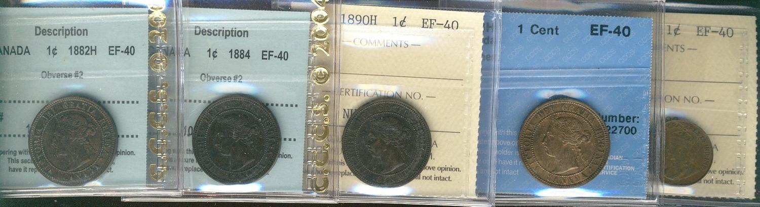 1882H, 1884 Obv 2, 1890H, 1898H & 1922 1¢ EF40. Lot of 5 coins all ICCS or CCCS graded.
