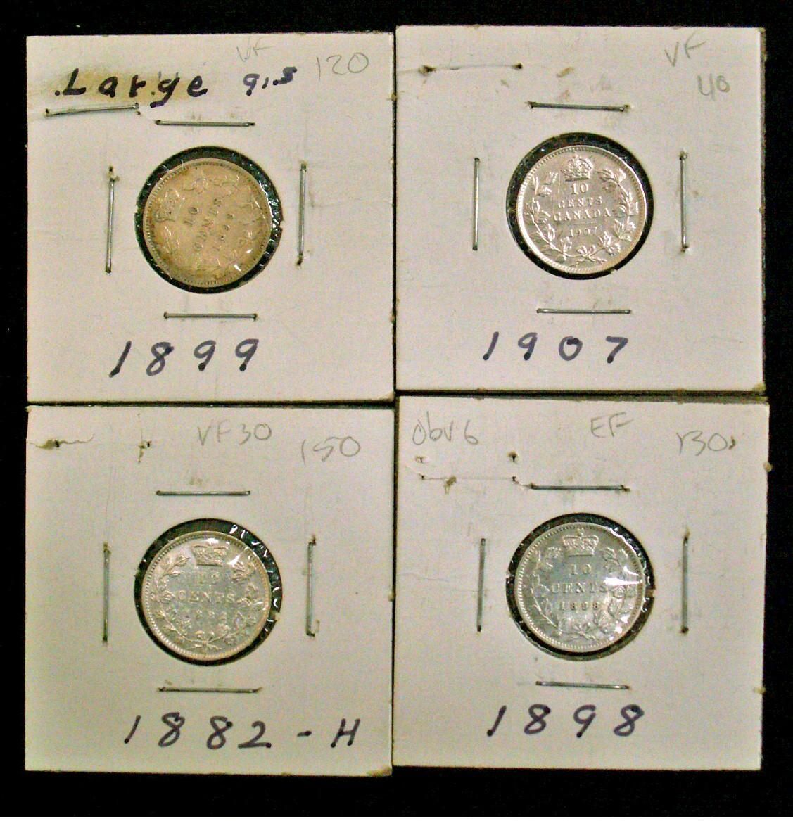 1882H, 1898, 1899 & 1907 10¢. Lot of 4 coins VF to VF++.