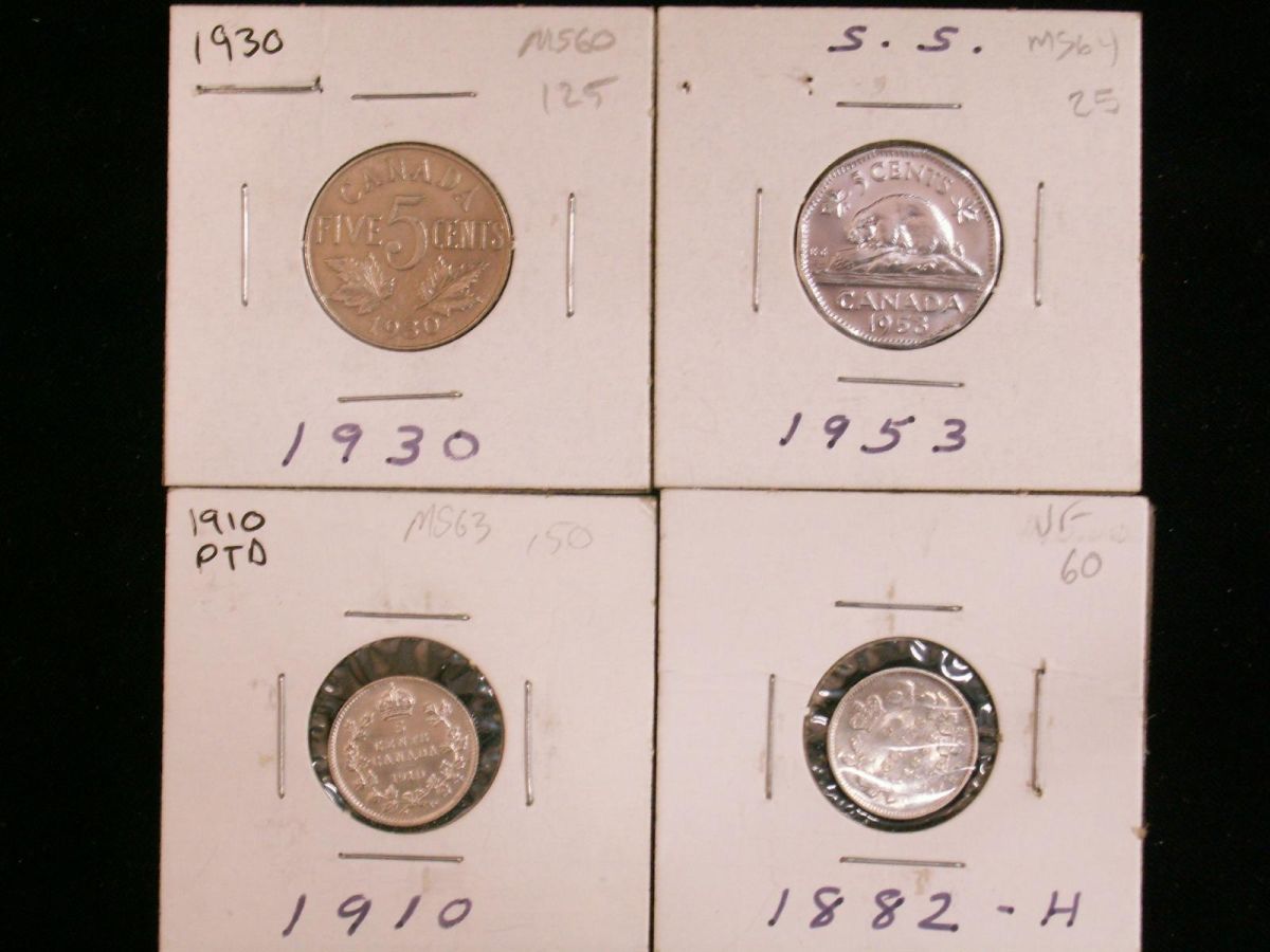 1882H, 1910, 1930 & 1953 Sf 5¢. Lot of 4 coins VF to AU55.