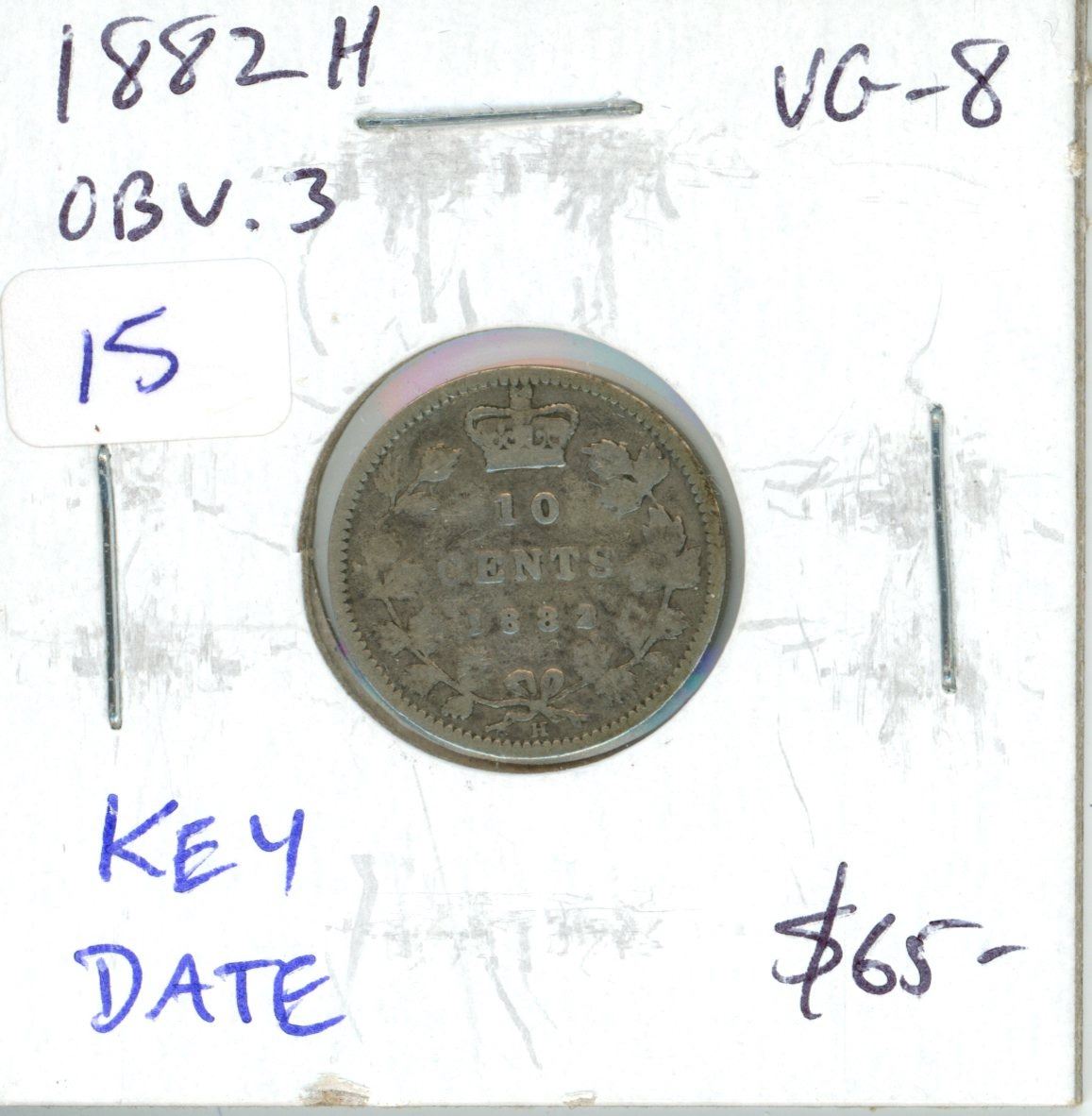 1882H Canadian Victorian Silver 10 Cents. Obverse 3. Heaton Mint. VG-8. Key Date.