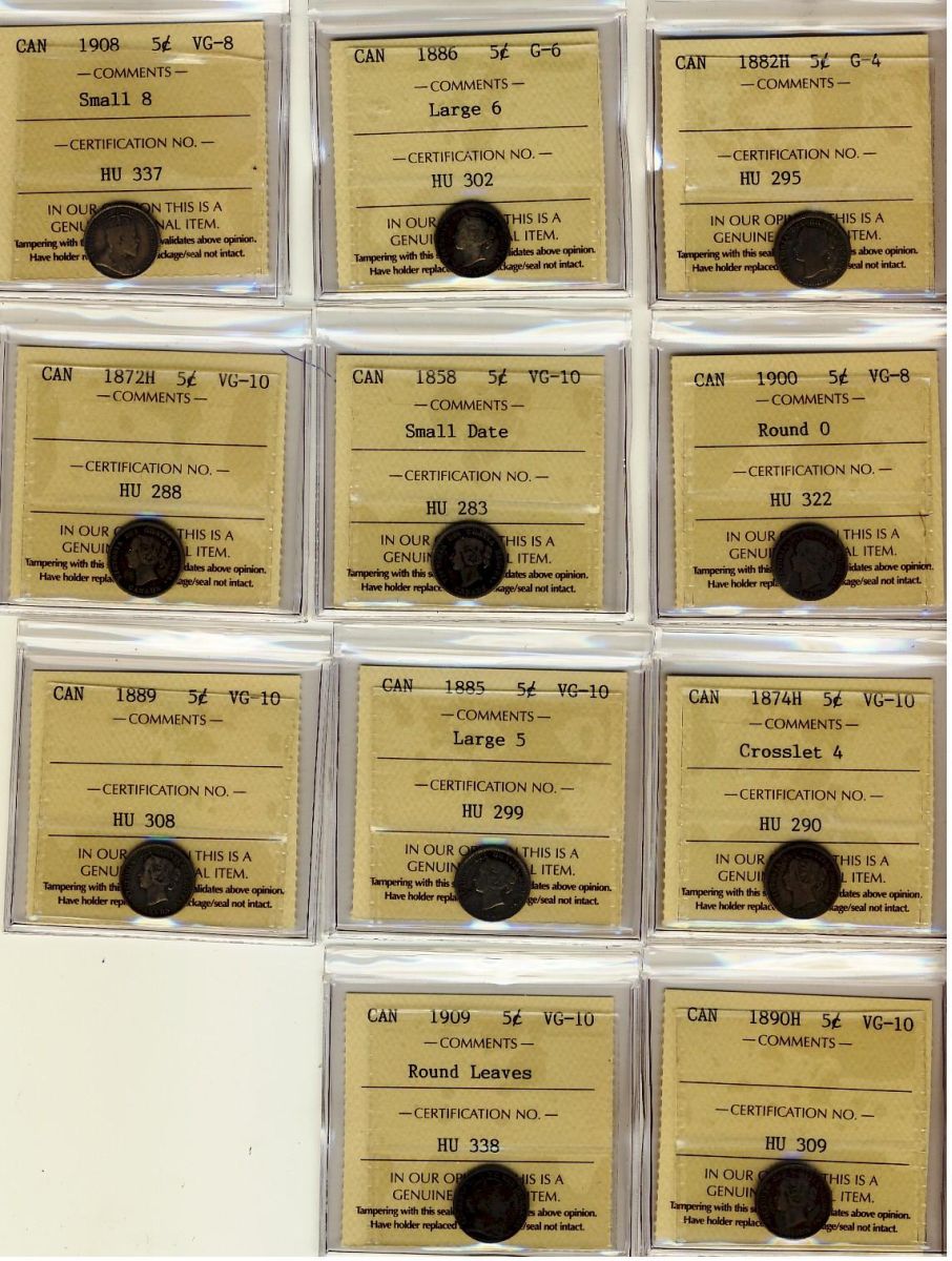 1882H G4, 1886 Lg6 G6, 1908 Sml 8 & 1900 Rd 0 VG8, 1858 Sml, 1872H, 1874H Crss, 1885 Lg 5, 1889, 1890H & 1909 RL 5¢ VG10. Lot of 11 coins all problem free.