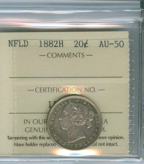 1882H Nfld 20¢ ICCS AU50, lightly toned. A scarce date.